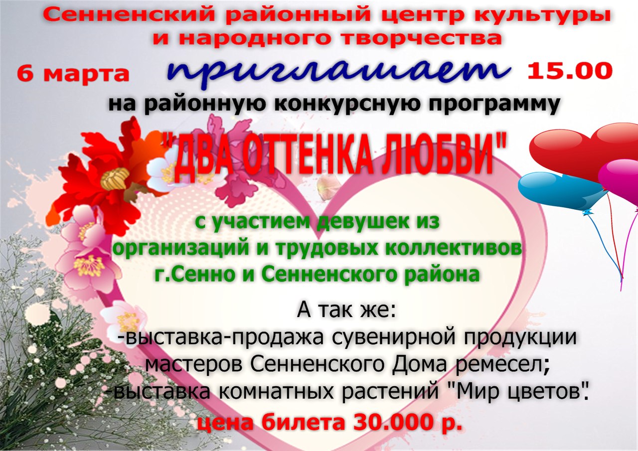 6 марта 2015 года в 15.00 в Сенненском районном центре культуры и народного творчества состоится праздничная конкурсная программа "Два оттенка любви"
