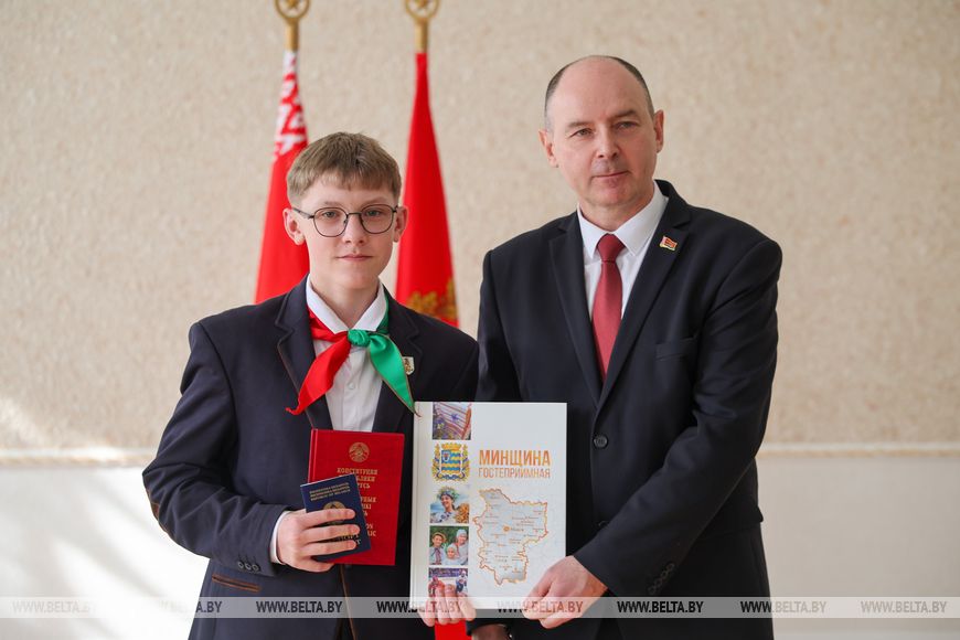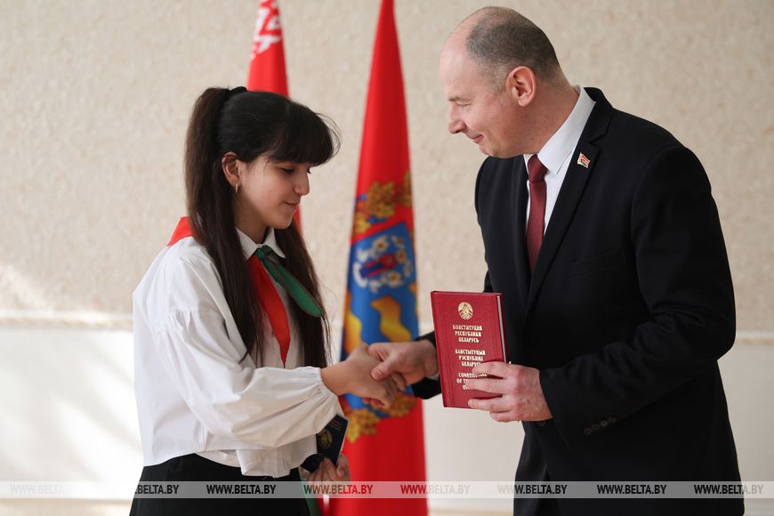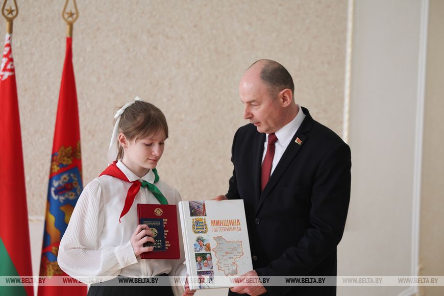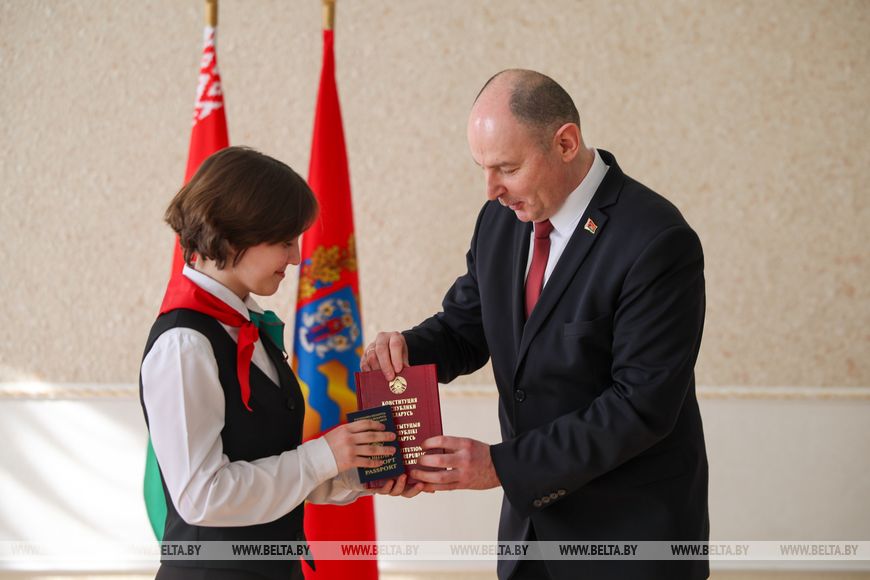 Поздравляя молодых людей с важным событием и вручая им паспорта, председатель Минского облисполкома Алексей Кушнаренко отметил, что этот документ прежде всего символизирует принадлежность к нашему государству, к его богатым традициям.