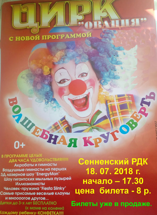 Сенненский районный центр культуры и народного творчества приглашает 18 июля 2018 г. на новую цирковую программу «Волшебная круговерть». Начало 17.30. Билеты уже в продаже