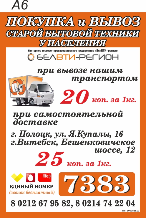 Внимание!!! Информация унитарного предприятия ”БелВТИ-регион“ о сборе отходов бытовой техники от населения<br />
