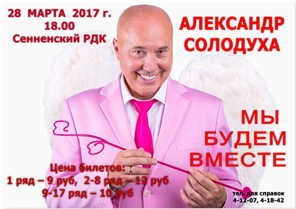 28 марта 2017 года в 18.00 в районном Центре культуры и народного творчества состоится концерт белорусского исполнителя Александра Солодухи, где на суд зрителей будет представлена новая концертная программа «Мы будем вместе». Стоимость билетов от 9 до 12 рублей.