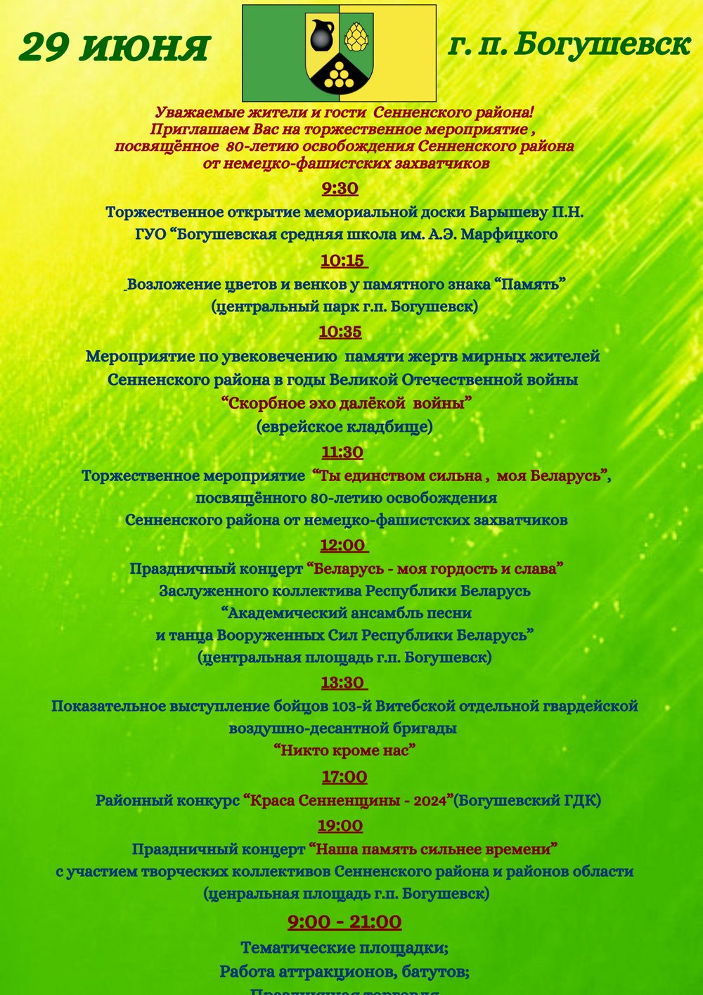 Программа мероприятий, посвященных 80-летию освобождения Сенненского района и бывшего Богушевского района от немецко-фашистских захватчиков, 29 июня 2024 г. в г.п. Богушевск