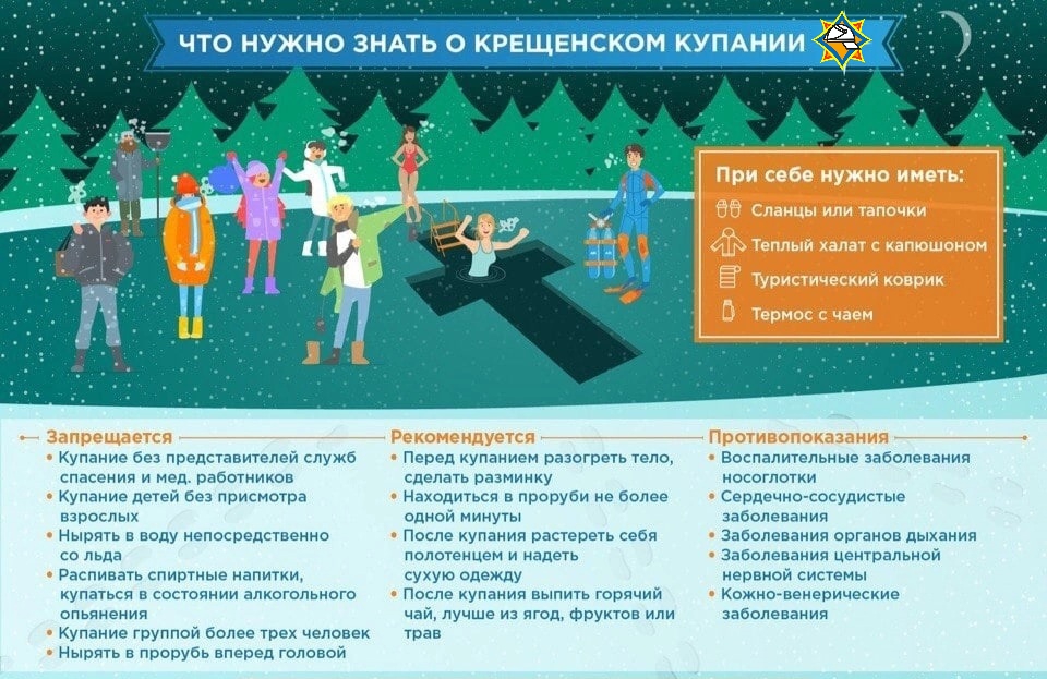 Работники МЧС и ОСВОД призывают делать это в специально организованных местах. Чтобы не подвергать свою жизнь опасности, ни в коем случае не следует купаться в состоянии алкогольного опьянения, нырять и плавать под водой, подавать крики ложной тревоги, собираться группами на льду у края полыньи, заходить за ограждения. Специалисты напоминают, что купание детей допускается только с родителями или взрослыми родственниками. Дети должны быть на расстоянии вытянутой руки, под постоянным присмотром взрослых.