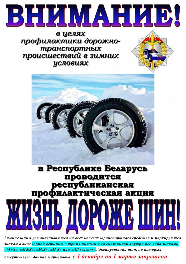 С 26 ноября 2018 года по 6 декабря 2018 года Госавтоинспекция Республики Беларусь проведет республиканскую профилактическую акцию «Жизнь дороже шин!» по предупреждению дорожно-транспортных происшествий в зимний период и пропаганде использования зимних шин.